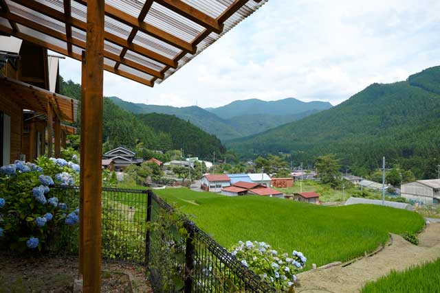 山の中腹にあるコテージからは、天川の美しい自然を見渡すことができます。下に見えるのは、家族で丹精込めて作っている田んぼです。
